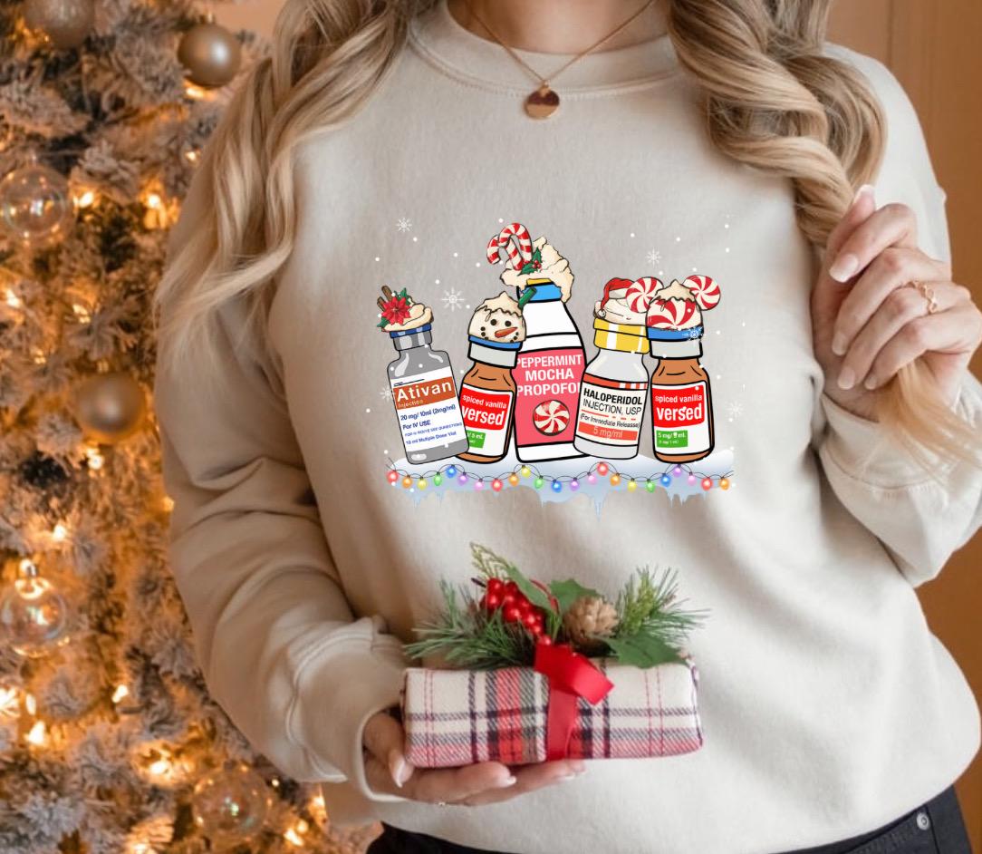 Bring holiday cheer to every shift with this hilarious Nurse Christmas Meds Sweatshirt! Designed especially for nurses, medical staff, and healthcare workers, this festive crewneck features iconic medications transformed into adorable holiday drinks β complete with candy canes, sprinkles, whipped cream, and winter dΓ©cor.