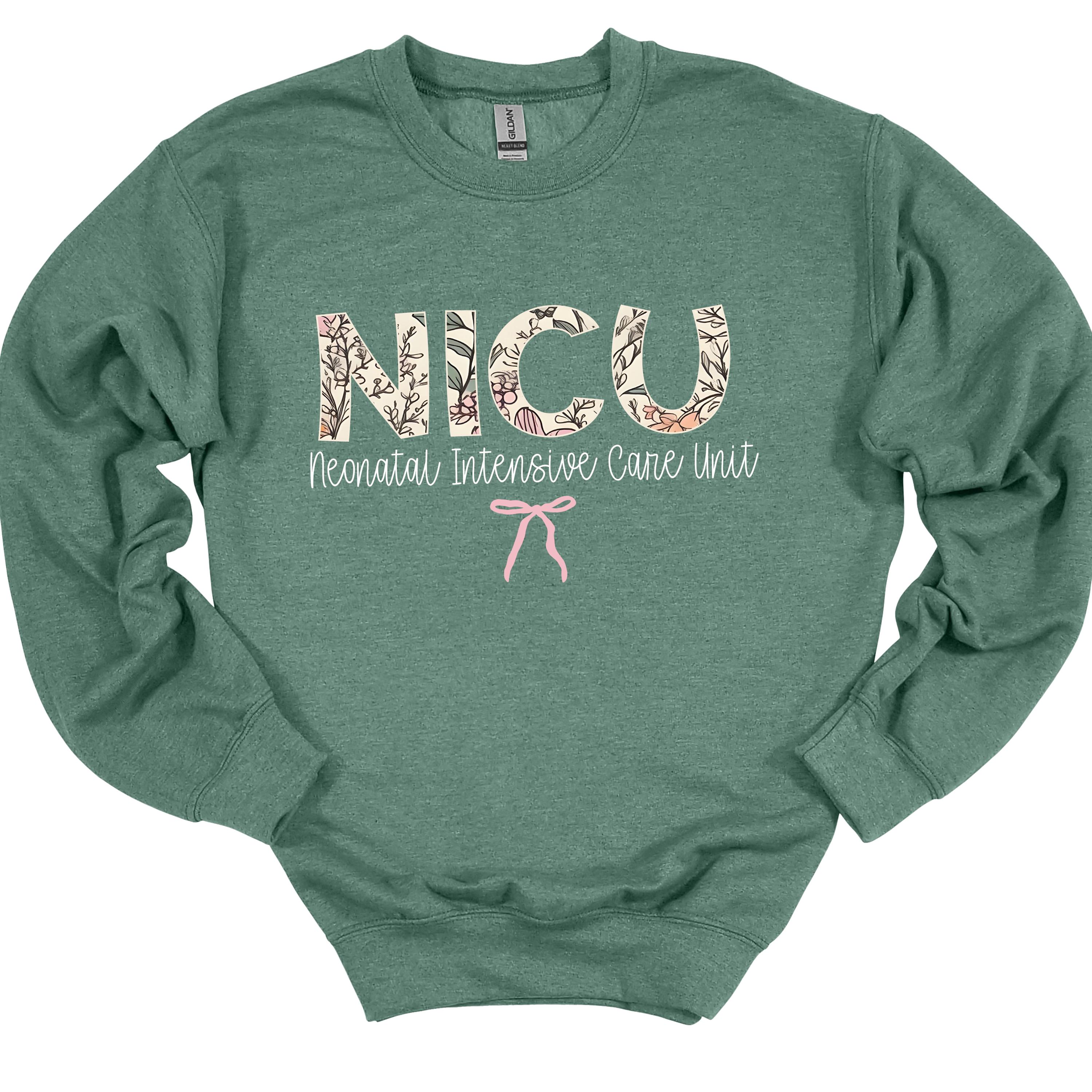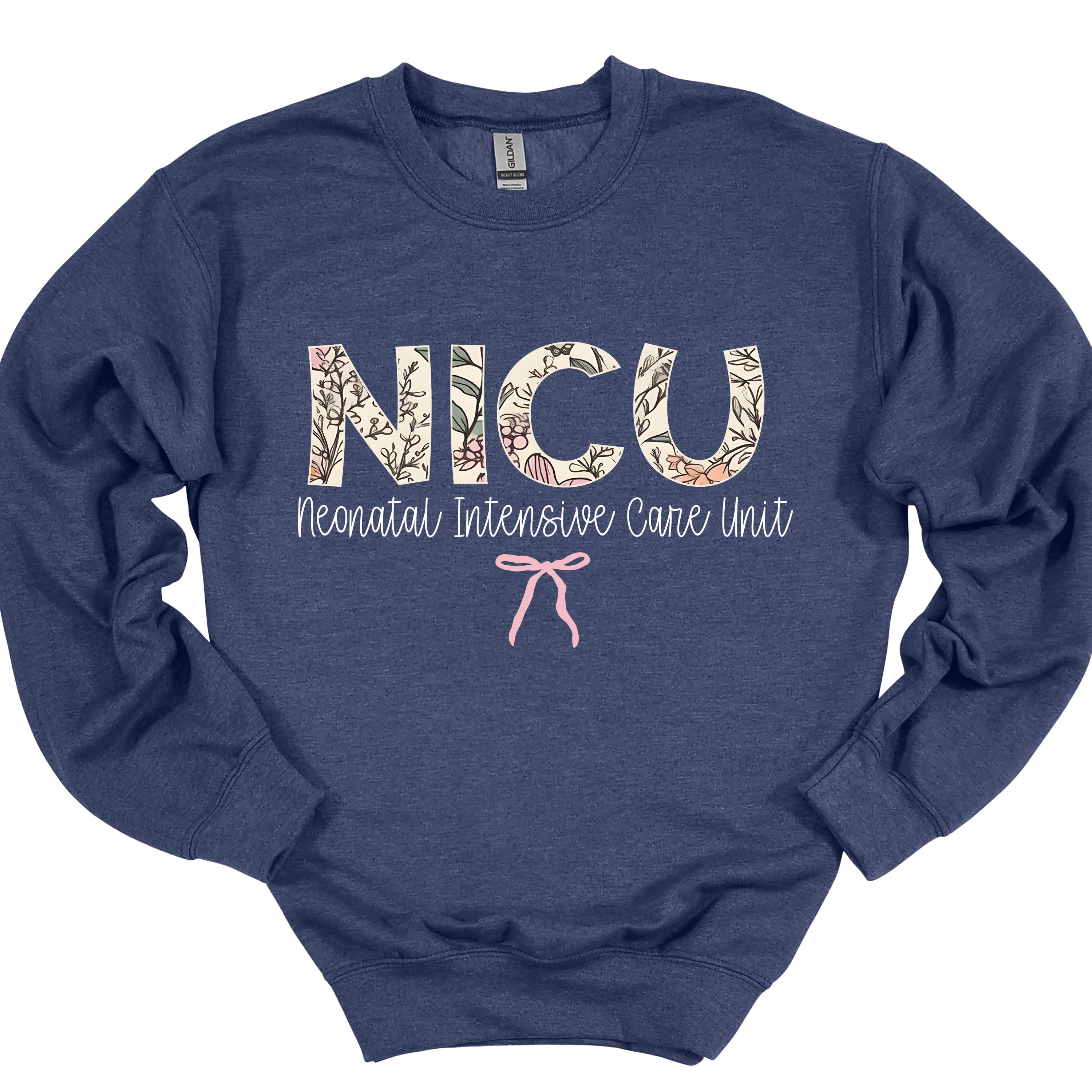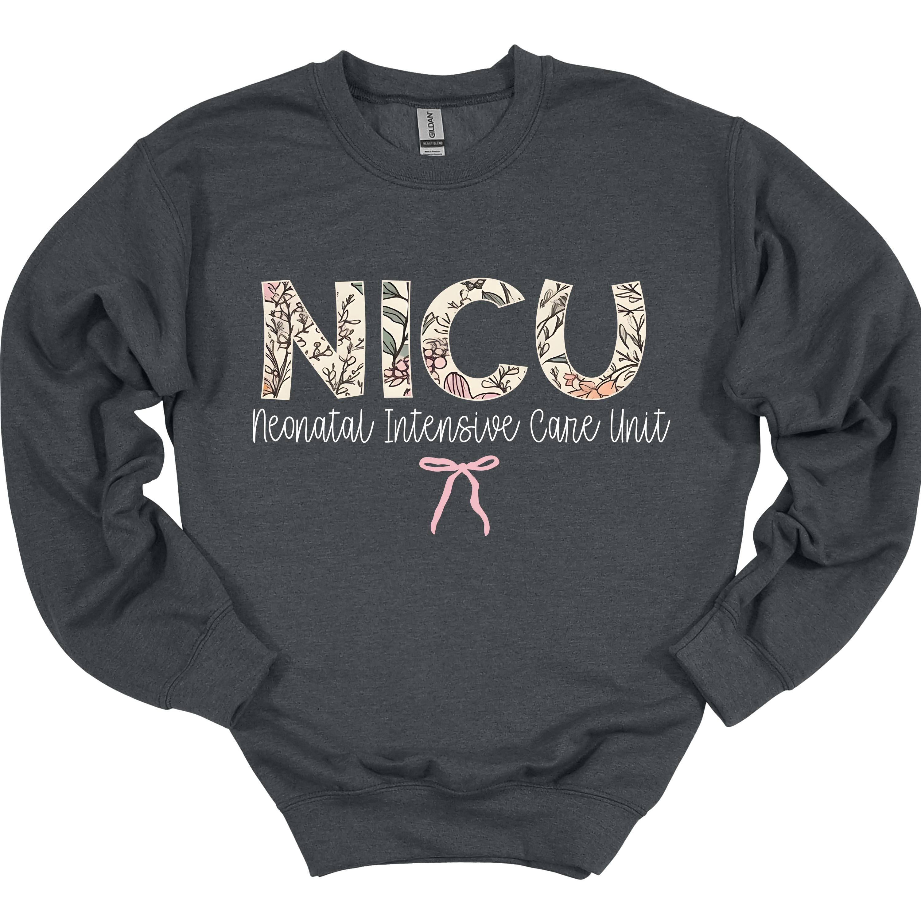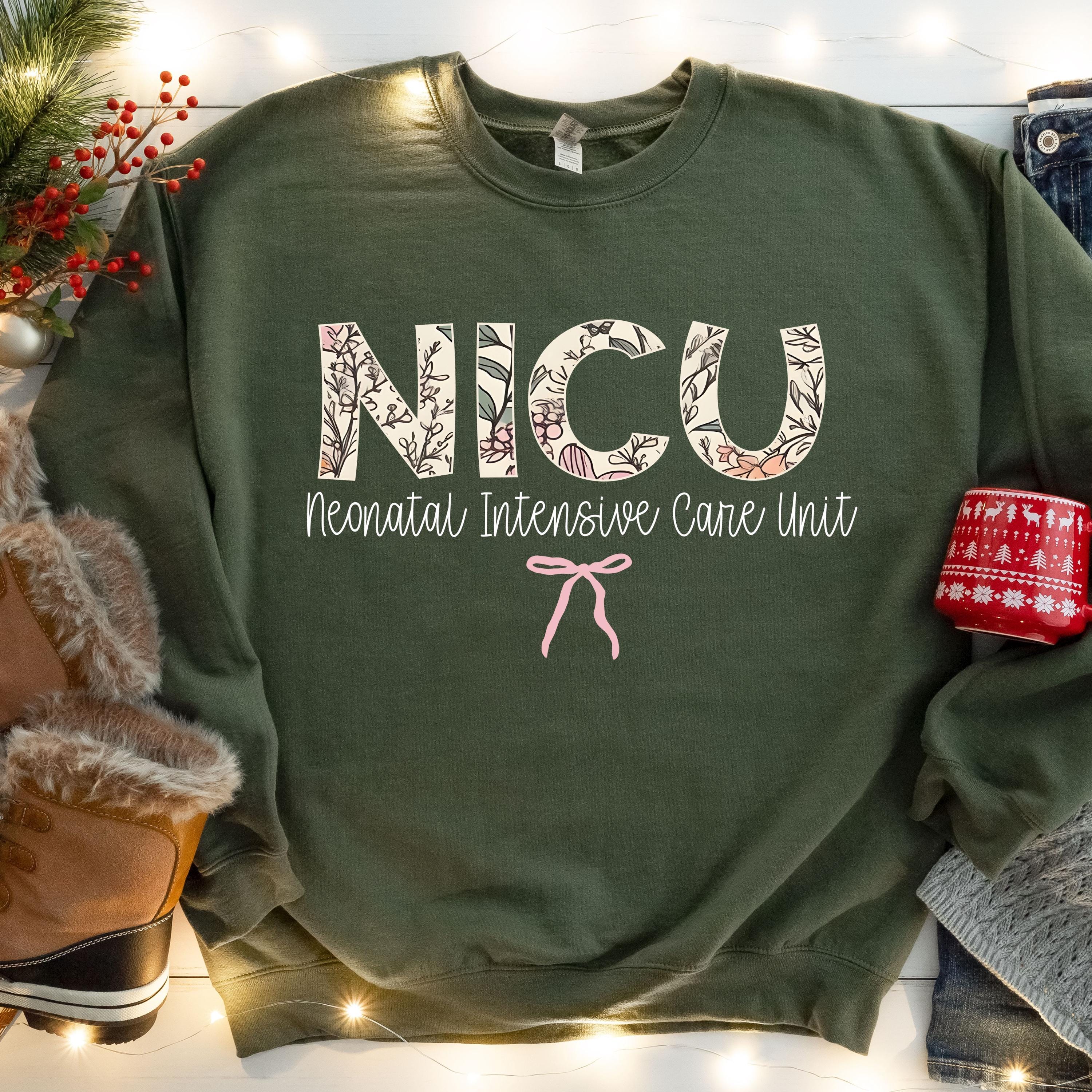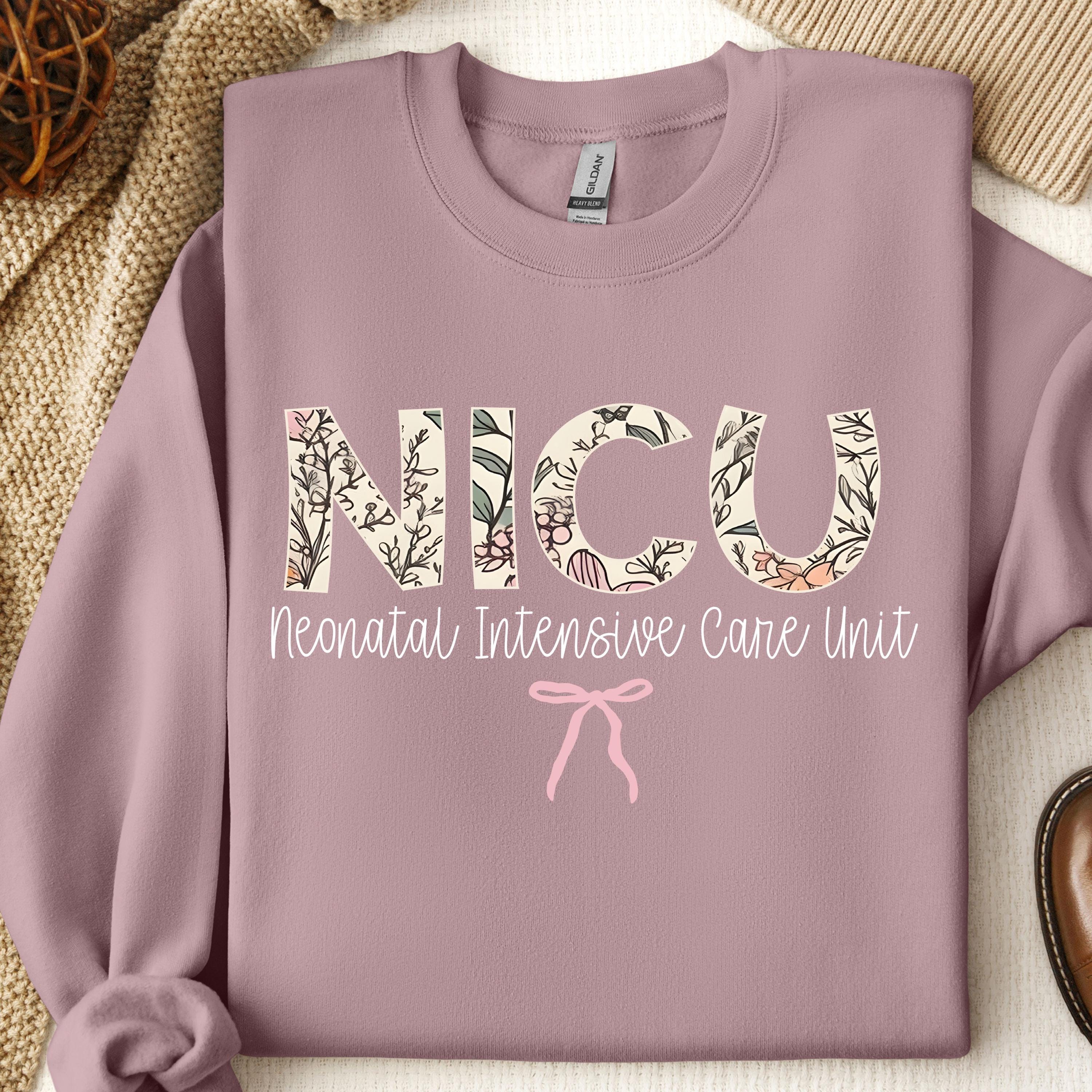 Crafted on a soft, premium crewneck, it features beautifully patterned floral “NICU” letters, handwritten-style Neonatal Intensive Care Unit text, and an adorable pink bow—making it both meaningful and stylish.
